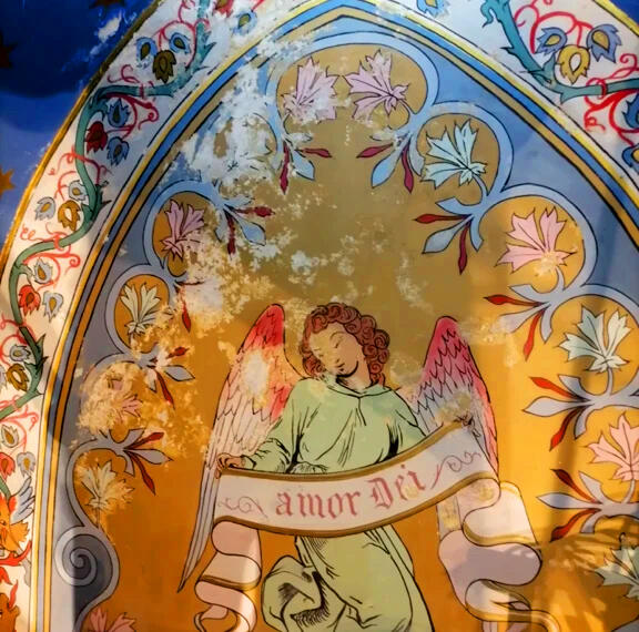 Coupe de pierre, polychromie clef de voûte cathédrale de Bayonne